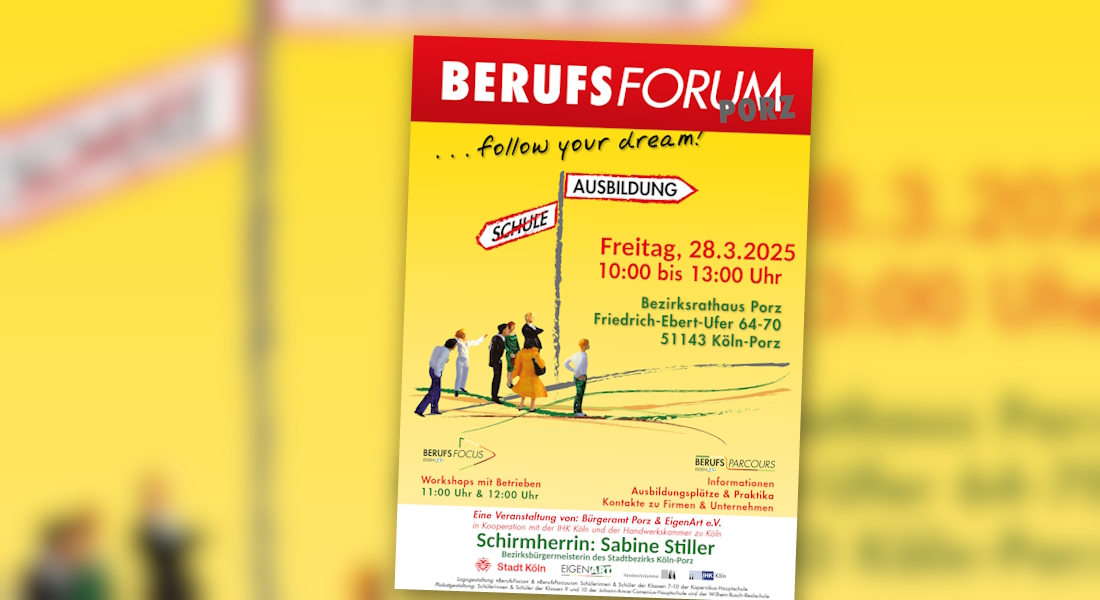 Dieses Jahr findet unser BERUFSFORUM Porz für Schüler*innen am Freitag, 28. März, von 10 bis 13 Uhr, wie immer, im Rathaussaal des Bürgeramts Porz statt.